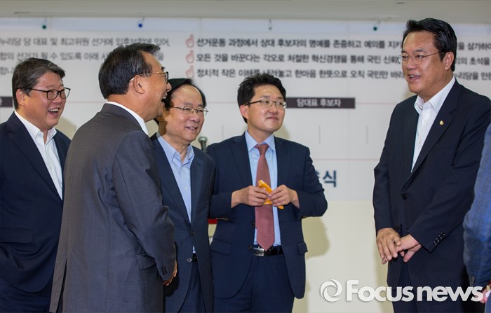 (서울=포커스뉴스) 정진석(오른쪽) 새누리당 원내대표와 이정현(왼쪽 두 번째) 의원이 9일 오전 서울 여의도 새누리당사에서 열린 '4차 전당대회 혁신과 화합의 선거 서약식'에 참석해 대화 하고 있다.