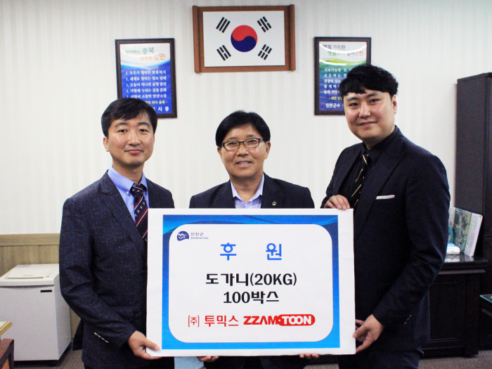 한편 투믹스는 진천군청을 시작으로 지속적인 지역 후원을 이어나갈 계획이다. 최근 회원 수 700만명 돌파, 월 페이지 뷰 1억건 기록 등 빠르게 성장한 웹툰 플랫폼 짬툰을 서비스 중인 투믹스는 규모의 성장에만 연연하지 않고 사회적 책임을 다하는 기업으로서 우리 주변의 이웃에 지속적인 관심과 지원을 이어나갈 계획이다.