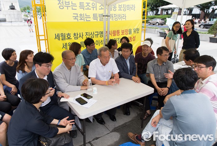 (서울=포커스뉴스) 참여연대 관계자들이 29일 오후 서울 광화문광장에서 열린 세월호특조위 진상규명촉구 보장 촉구 기자회견 마친 후 단식농성 중인 이석태 세원호참사 특별조사위원회 위원장을 지지방문하고 있다.