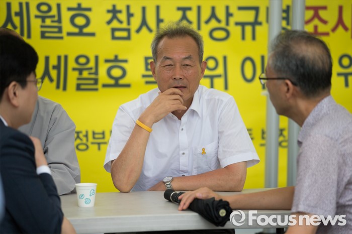 (서울=포커스뉴스) 이석태 세월호참사 특별조사위원회 위원장이 29일 오후 서울 광화문광장에서 열린 세월호특조위 진상규명활동 보장 촉구 기자회견 후 참여연대 관계자들과 대화 나누고 있다.