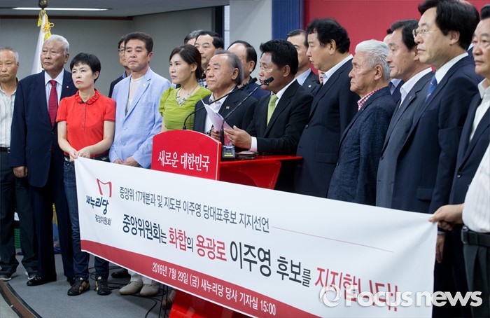(서울=포커스뉴스) 새누리당 중앙위원회 17개 분과 위원장들과 상임전국위원, 지도위원 등이 29일 오후 서울 여의도 당사에서 전당대회 출마를 선언한 이주영 의원 지지 기자회견을 하고 있다.