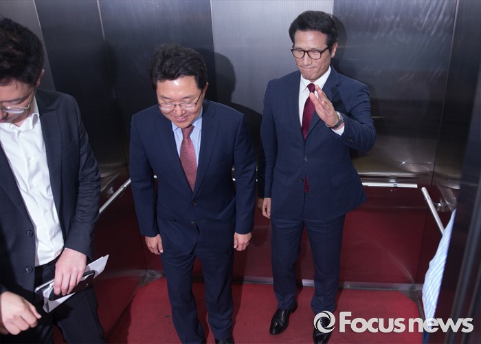 (서울=포커스뉴스) 전당대회 대표최고위원 출마를 선언한 정병국(오른쪽), 김용태 새누리당 의원이 29일 오후 서울 여의도 당사에서 단일화 발표 기자회견을 마친 뒤 승강기에 올라 이동하고 있다. 이날 두 의원은 여론조사를 통해 정병국 의원으로 단일화를 결정했다.