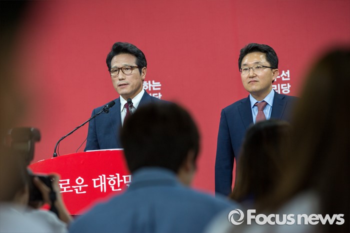 (서울=포커스뉴스) 새누리당 전당대회 대표최고위원 출마를 선언한 정병국(왼쪽), 김용태 의원이 29일 오후 서울 여의도 당사에서 단일화 발표 기자회견을 하고 있다. 이날 두 의원은 여론조사를 통해 정병국 의원으로 단일화를 결정했다.