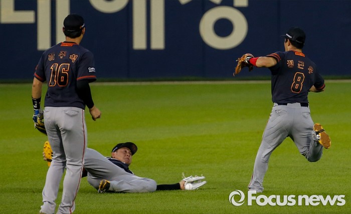 (서울=포커스뉴스) 26일 서울 잠실구장에서 열린 2016 프로야구 한화-두산 경기에서 3회말 무사 두산 류지혁의 빗맞은 타구를 한화 좌익수 양성우가 포구를 시도, 실패하고 있다