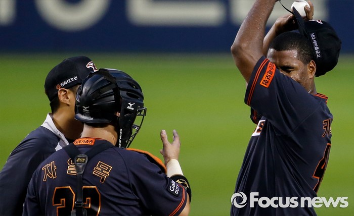 (서울=포커스뉴스) 26일 서울 잠실구장에서 열린 2016 프로야구 한화-두산 경기에서 3회말 한화 선발투수 카스티요가 포수 차일목과 대화하고 있다.