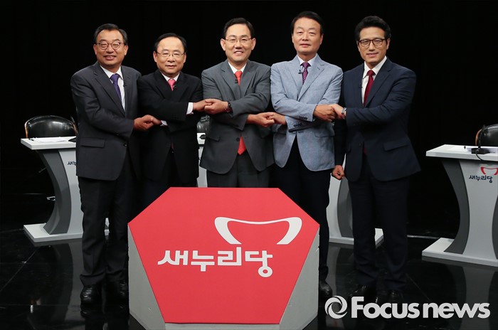 (서울=포커스뉴스) 29일 오후 서울 마포구 상암동 DMC에서 종합편성채널 채널A 주최로 열린 새누리당 대표 경선 1차 토론회에 참석한 의원들이 토론에 앞서 포즈를 취하고 있다. 왼쪽부터 이정현, 이주영, 주호영, 한선교, 정병국 의원.