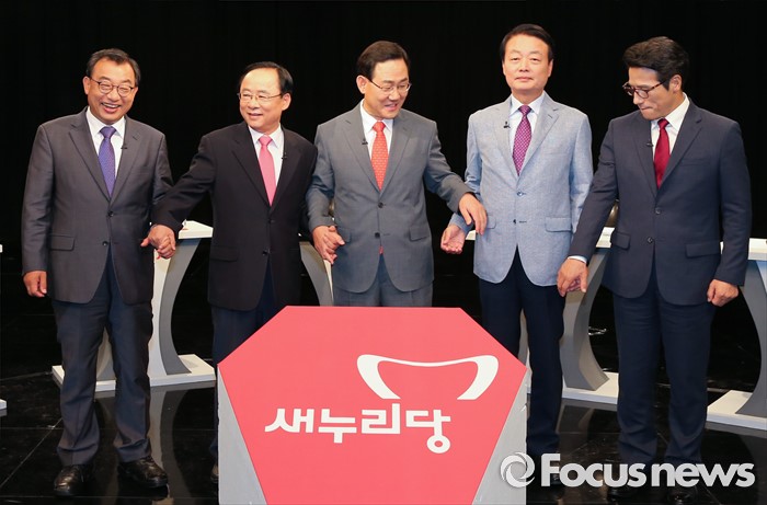 (서울=포커스뉴스) 29일 오후 서울 마포구 상암동 DMC에서 종합편성채널 채널A 주최로 열린 새누리당 대표 경선 1차 토론회에 참석한 의원들이 토론에 앞서 포즈를 취하고 있다. 왼쪽부터 이정현, 이주영, 주호영, 한선교, 정병국 의원.