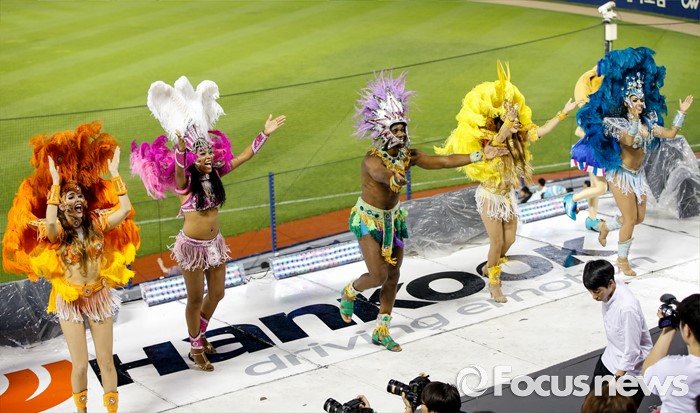 (서울=포커스뉴스) 26일 서울 잠실구장에서 열린 2016 프로야구 한화-두산 경기를 찾은 브라질 무용단이 열띤 공연을 펼치고 있다.