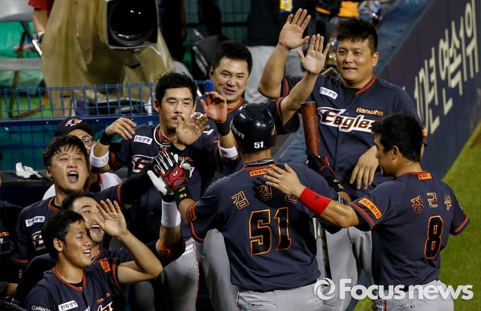 (서울=포커스뉴스) 26일 서울 잠실구장에서 열린 2016 프로야구 한화-두산 경기 연장 11회초 2사 상황에서 한화 김경언이 역전 홈런을 친 후 동료들의 축하를 받고 있다.