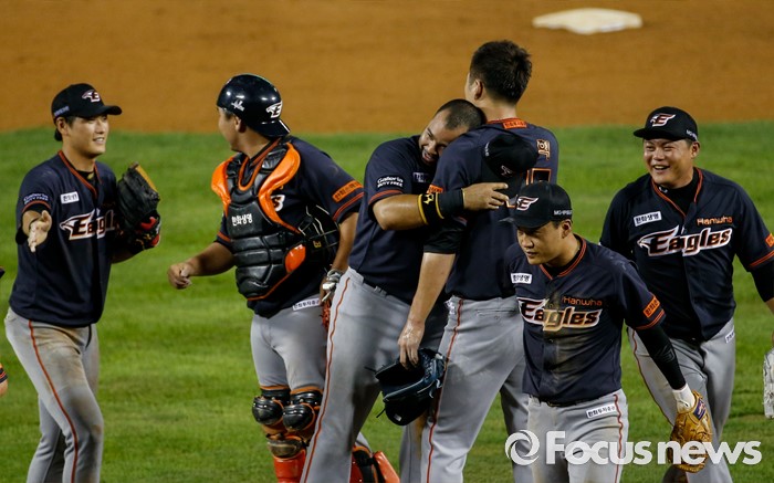 (서울=포커스뉴스) 29일 서울 잠실구장에서 열린 2016 프로야구 한화-두산 경기 연장 11회말 한화 투수 권혁이 승리를 확정지은 후 로사리오의 포옹을 받고 있다.