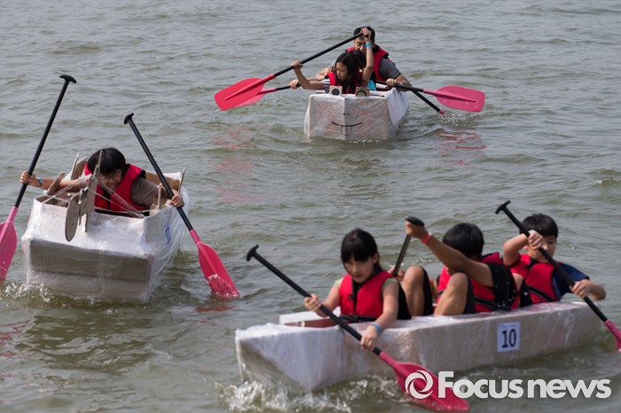 (서울=포커스뉴스) 30일 오후 서울 송파구 잠실한강공원에서 열린 한강 종이배 경주대회 '박스원레이스'에 참가한 시민들이 종이배를 타고 경주를 하고 있다.