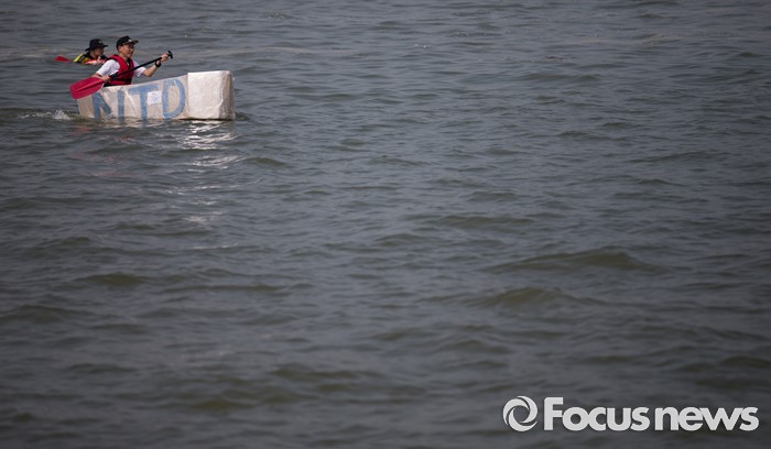 (서울=포커스뉴스) 30일 오후 서울 송파구 잠실한강공원에서 열린 한강 종이배 경주대회 '박스원레이스'에 참가한 한 시민이 노를 젓고 있다.