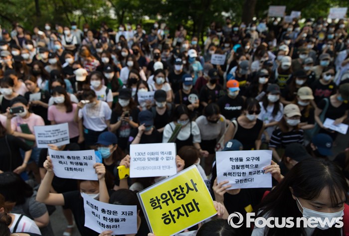 (서울=포커스뉴스) 30일 오후 서울 서대문구 이화여자대학교 본관 앞에서 고졸 출신 직장인 등을 위한 단과대 설립을 반대하는 학생들이 경찰의 폭력 진압 의혹 기자회견을 하고 있다. 이날 오후 경찰은 학교 측 요청으로 갇혀 있던 교수, 교직원을 데리고 나왔으며 이 과정에서 경찰과 재학생 간 충돌이 있었다.