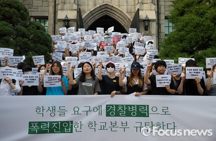 (서울=포커스뉴스) 30일 오후 서울 서대문구 이화여자대학교 본관 앞에서 고졸 출신 직장인 등을 위한 단과대 설립을 반대하는 학생들이 경찰의 폭력 진압 의혹 기자회견 중 폭력진압 학교본부 규탄 구호를 외치고 있다. 이날 오후 경찰은 학교 측 요청으로 갇혀 있던 교수, 교직원을 데리고 나왔으며 이 과정에서 경찰과 재학생 간 충돌이 있었다.