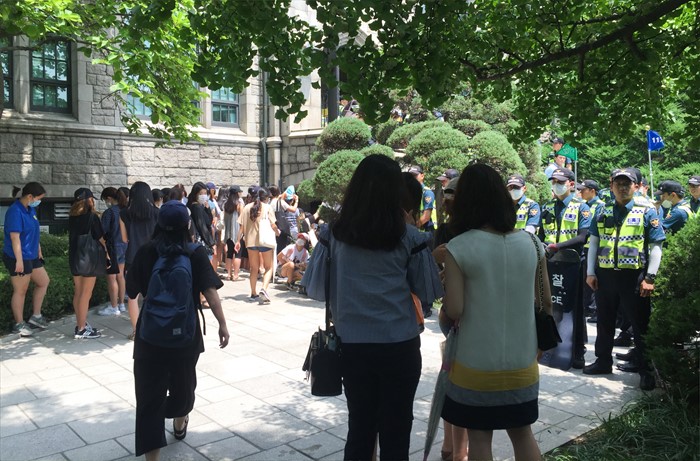 (서울=포커스뉴스) 30일 오후 서울 서대문구 이화여대 본관 앞에서 경찰들이 고졸 출신 직장인 등을 위한 단과대 설립을 반대하는 학생들과 대치하고 있다. <사진제공=이화여대 재학생>