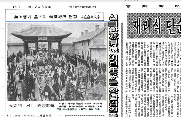 (서울=포커스뉴스) 1986년 4월 30일자 경향신문에 거재된 미 여행가 홈즈가 한국기행중 촬영한 고종의 어가행렬사진.이 기사에 의하면 명성황후 묘소에 가기위해 대안문을 나서는 고종의 어가행렬이라고 나와있다. 1897년 장례식 이후, 대안문이 대한문으로 바뀌기 전인1906년 사이에 찍은 것으로 추정된다.