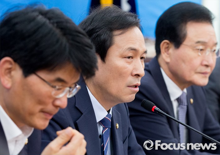 (서울=포커스뉴스) 1일 오전 서울 여의도 국회에서 열린 더불어민주당 원내대책회의에 참석한 우상호 원내대표가 모두발언을 하고 있다.
