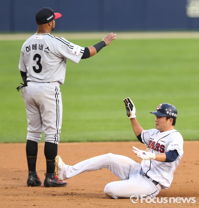 (서울=포커스뉴스) 3일 서울 잠실구장에서 열린 2016 프로야구 LG-두산 경기 1회말 1사 1루에서 두산 민병헌의 좌전안타때 1루주자 류지혁이 3루에서 슬라이딩하며 안착하고 있다.
