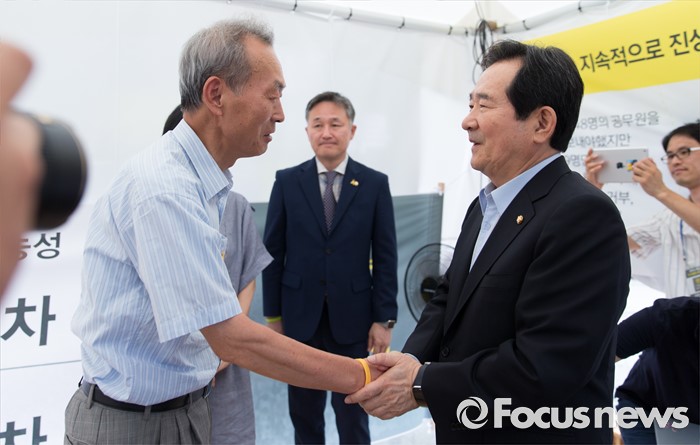 (서울=포커스뉴스) 정세균(오른쪽) 국회의장이 2일 오전 서울 종로구 광화문광장에서 단식농성 중인 이석태 세월호 참사 특별조사위원장과 만나 악수를 하고 있다.