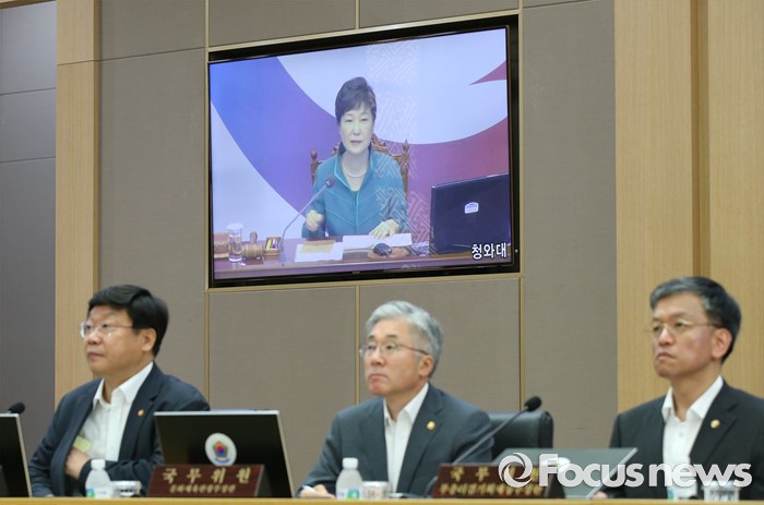 (세종=포커스뉴스) 2일 오전 세종시 정부세종청사 국무회의장에서 열린 청와대-세종 영상 국무회의에서 국무위원들이 박근혜 대통령의 모두발언을 듣고 있다.
