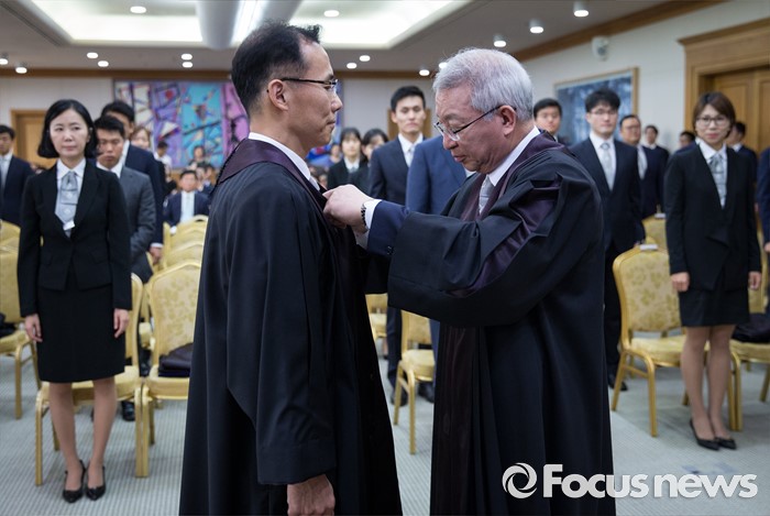 (서울=포커스뉴스) 1일 오전 서울 서초동 대법원에서 열린 신임 법관 임명식에서 양승태 대법원장이 신임 법관에게 법복을 입혀주고 있다.