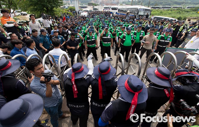 (아산=포커스뉴스) 1일 오후 충남 아산 탕정면 갑을오토텍에서 노조원들과 사측 경비 용역들이 대치하고 있다.
