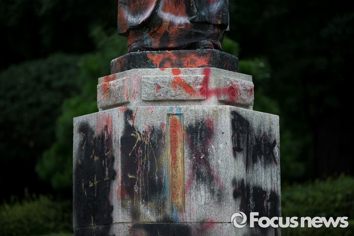 (서울=포커스뉴스) 이화여대 미래라이프 대학 설립 문제로 학교와 학생들이 갈등을 빚고 있는 2일 오전 서울 서대문구 이화여대 본관 인근에 김활란 초대 총장의 동상이 페인트와 계란으로 얼룩져있다.