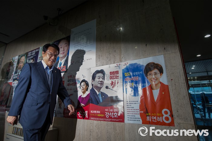 (서울=포커스뉴스) 정진석 새누리당 원내대표가 혁신비상대책위원회의에 참석하기 위해 1일 오전 서울 여의도 새누리당사로 들어서며 오는 9일 전당대회 당대표 및 최고위원 출마 후보들의 포스터 앞을 지나고 있다.