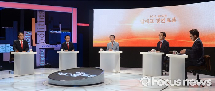 (서울=포커스뉴스) 2일 오후 서울 상암동 MBC 스튜디오에서 열린 '새누리당 대표 경선 TV토론회'에 참석한 의원들이 토론 준비를 하고 있다. 왼쪽부터 이정현, 이주영, 한선교, 주호영, 정병국 의원.