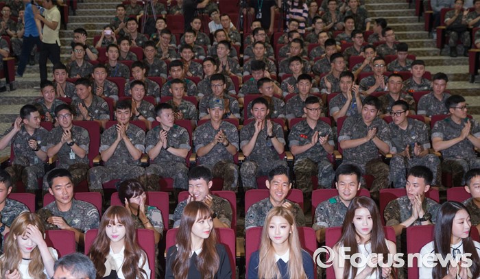 (서울=포커스뉴스) 2일 오전 서울 용산구 국방부에서 열린 '군인 금연 홍보 엔젤스 위촉식'에서 금연 홍보대사로 위촉된 그룹 러블리즈가 군장병들의 환호 속에 착석하고 있다.