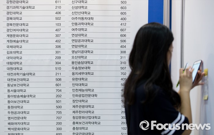 (서울=포커스뉴스) 3일 오후 서울 강남구 코엑스에서 열린 2017학년도 수시 전문대학 입학정보 박람회에서 한 학생이 입학상담 할 학교를 고르고 있다.
