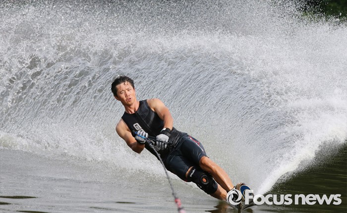 (공주=포커스뉴스) 3일 오후 충남 공주시 금강변에서 수상스포츠전문가들이 스상스키를 타며 물살을 가르고 있다.