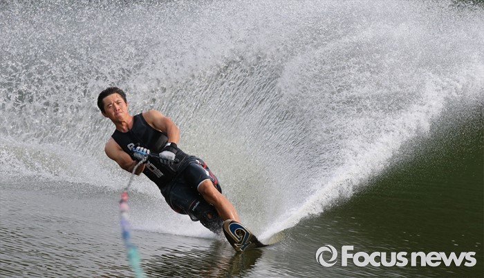 (공주=포커스뉴스) 3일 오후 충남 공주시 금강변에서 수상스포츠전문가들이 스상스키를 타며 물살을 가르고 있다.