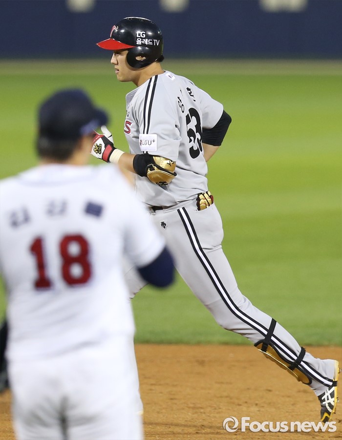 (서울=포커스뉴스) 3일 서울 잠실구장에서 열린 2016 프로야구 LG-두산 경기 4회초 무사 3루에서 LG 양석환이 좌월 홈런을 날리고 베이스를 돌고 있다.