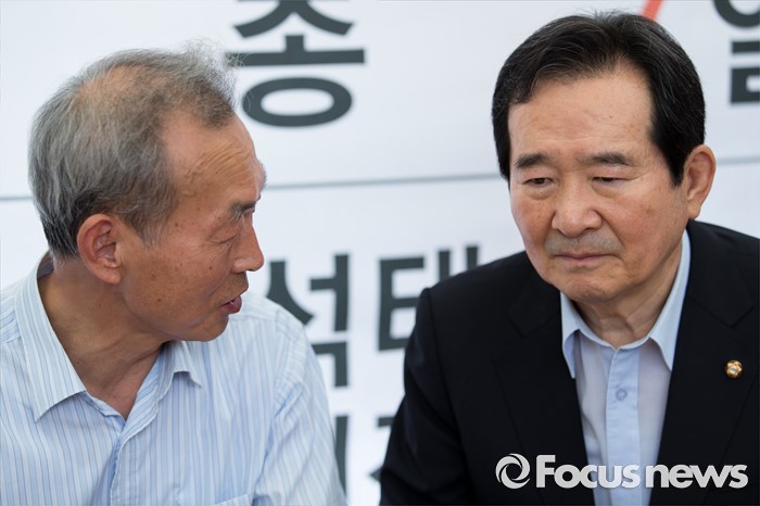 (서울=포커스뉴스) 정세균(오른쪽) 국회의장이 2일 오전 서울 종로구 광화문광장에서 단식농성 중인 이석태 세월호 참사 특별조사위원장과 만나 이야기를 나누고 있다.