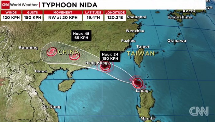 미국 CNN은 홍콩기상청 발표를 인용해 태풍 니다의 영향권에 있는 홍콩에서 시속 145㎞의 강풍이 불고 있다고 2일 보도했다. 홍콩기상청은 1일 오후 2번째로 높은 단계의 태풍 경보를 발령했다. 또 급작스러운 홍수 가능성도 고려하고 있다.