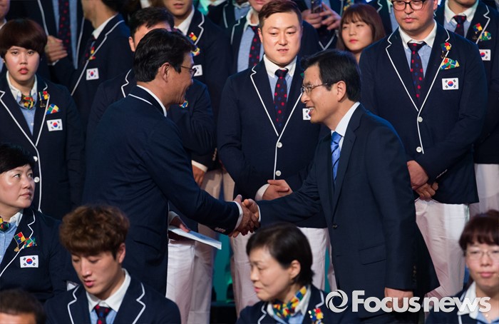 | △ 악수하는 황교안 총리와 정재준 선수단장 |