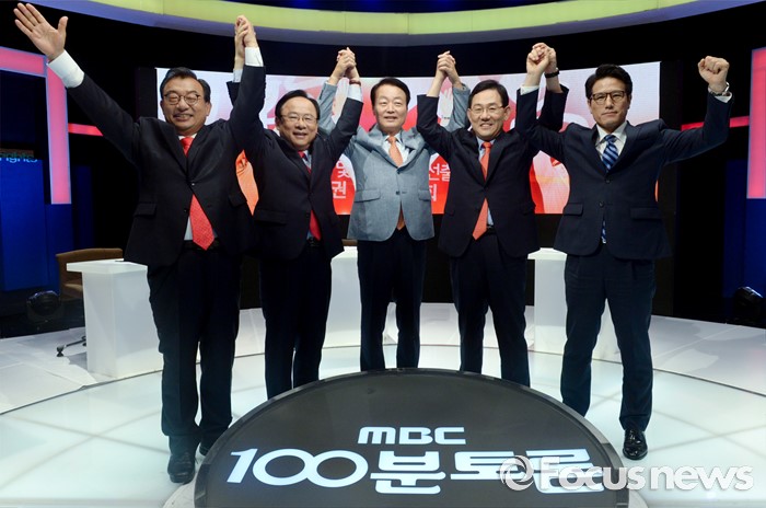 (서울=포커스뉴스) 2일 오후 서울 상암동 MBC 스튜디오에서 열린 '새누리당 대표 경선 TV토론회'에 참석한 의원들이 포즈를 취하고 있다. 왼쪽부터 이정현, 이주영, 한선교, 주호영, 정병국 의원.