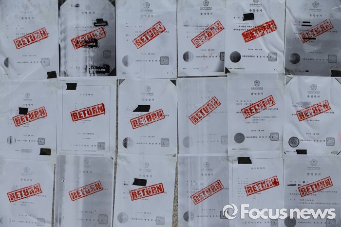 (서울=포커스뉴스) 미래라이프 대학 설립에 반대하는 학생측이 엿새째 이화여대 본관을 점거하고 있는 2일 오전 서울 서대문구 이화여대 정문 앞에 졸업장 복사본이 부착돼 있다.