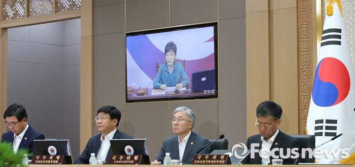 (세종=포커스뉴스) 2일 오전 세종시 정부세종청사 국무회의장에서 열린 청와대-세종 영상 국무회의에서 국무위원들이 박근혜 대통령의 모두발언을 듣고 있다.