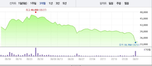YG엔터는 3일 오전 9시31분 현재 전거래일 대비 0.15%(50원) 하락한 3만4050원에 거래되고 있다. YG엔터는 7월29일부터 이달 2일까지 1~8%의 낙폭을 기록했다.
