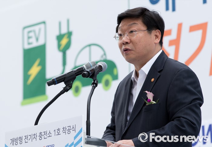 (서울=포커스뉴스) 2일 오후 서울 마포구 상암월드컵경기장에서 개방형 전기차 충전소 1호 착공식에 참석한 주형환 산업통상자원부 장관이 축사를 하고 있다.