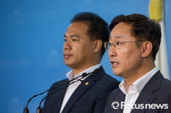 (서울=포커스뉴스) 박범계(오른쪽) 더불어민주당 의원과 이용주 국민의당 의원이 2일 오후 서울 여의도 국회에서 고위공직자 비리수사처 관련 경과 및 향후 일정에 대해 발표 하고 있다.