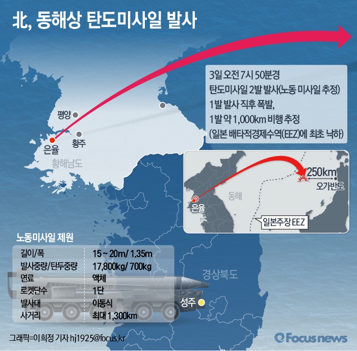 북한은 3일 오전 7시50분쯤 동해상으로 '노동'으로 추정되는 탄도미사일 두 발을 발사했다. 이 중 한 발은 1000㎞ 상공을 날아 일본의 배타적경제수역(EEZ)에 낙하했다. 북한 미사일이 일본 EEZ에 떨어진 것은 이번이 처음이다.(게티/포커스뉴스) 유럽연합(EU) 국기. 2016.07.20 ⓒ게티이미지/이매진스 (서울=포커스뉴스) 북한이 3일 오전 7시50분쯤 황해남도 은율 일대에서 동해로 노동미사일로 추정되는 탄도미사일 2발을 발사했다. 2발 중 1발은 발사 직후 폭발했으며 1발은 약 1000km가량 비행해 일본 아키타(秋田)현 오가(男鹿)반도 서쪽 250㎞ 지점의 배타적 경제수역(EEZ)에 낙하한 것으로 분석됐다. 북한 탄도미사일이 일본의 EEZ에 낙하한 것은 이번이 처음이다.2016.08.03 이희정 기자
