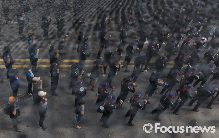 (아산=포커스뉴스) 1일 오후 충남 아산 탕정면 갑을오토텍에서 노조원들과 사측 경비 용역들이 대치하고 있다.