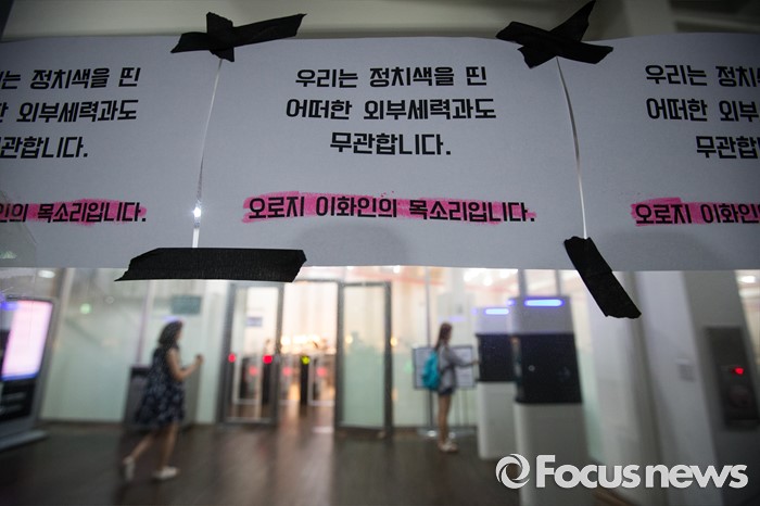 (서울=포커스뉴스) 미래라이프 대학 설립에 반대하는 학생들이 엿새째 이화여대 본관을 점거하고 있는 2일 밤, 서울 서대문구 이화여대 교내에 다양한 목소리의 시위성 글들이 붙어 있다.