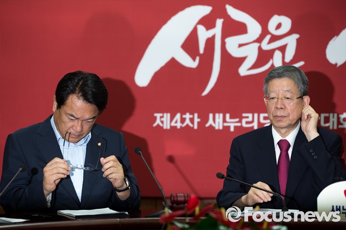 (서울=포커스뉴스) 김희옥(오른쪽) 새누리당 혁신비상대책위원장과 정진석 원내대표가 1일 오전 서울 여의도 새누리당사에서 열린 혁신비상대책위원회의에 참석하고 있다.