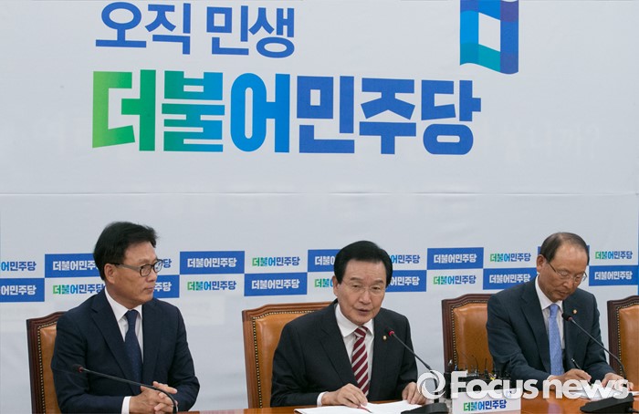 (서울=포커스뉴스) 변재일 더불어민주당 정책위의장이 2일 오전 서울 여의도 국회에서 세법개정안 관련 기자간담회를 하고 있다. 왼쪽부터 박광온 기획재정위원회 간사, 변 정책위의장, 최운열 정책위부의장.