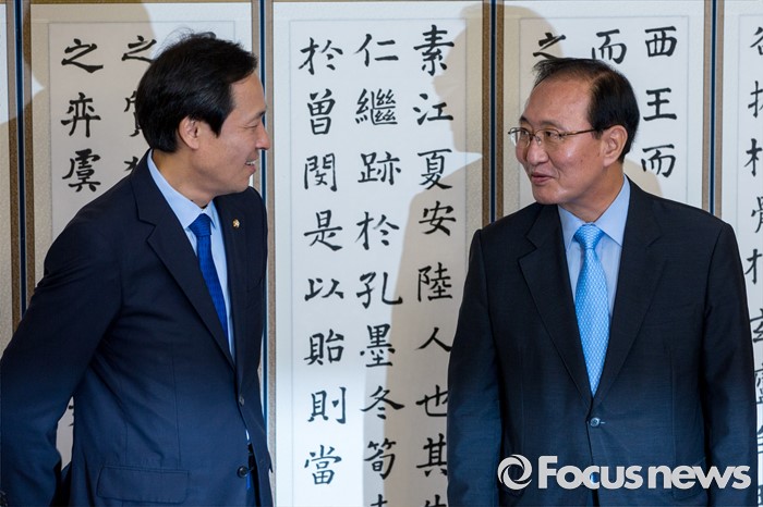 (서울=포커스뉴스) 우상호(왼쪽) 더불어민주당 원내대표와 노회찬 정의당 원내대표가 3일 오전 서울 여의도 국회에서 열린 원내대표 회동에 참석해 대화 하고 있다.