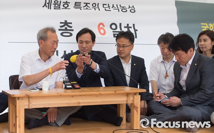 (서울=포커스뉴스) 1일 오전 서울 종로구 광화문 광장에 우상호 더불어민주당 원내대표가 이석태 세월호 참사 툭별조사위원장에게 마이크를 건내고 있다.